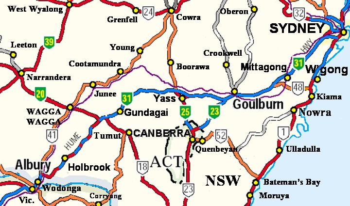 Canberra can be accessed by the Hume Highway with connections at Federal Highway (green National Highway 23) and Barton Highway (National Highway 25). It can also be accessed from the south by the Monaro Highway (white National Highway 23
