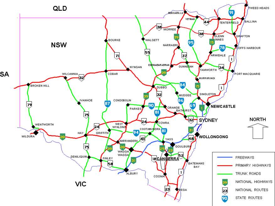 A road map of the State of New South Wales, Australia. Find the best route between Canberra, Newcastle, Sydney and Wollongong. Locations on this map of New South Wales include Albury-Wodonga, Armidale, Bathurst, Broken Hill, Cessnock, Coffs Harbour, Bourke, Dubbo, Gosford, Goulburn, Grafton, Lake Macquarie, Lismore, Maitland, Newcastle, Nowra, Orange, Port Macquarie, Sydney, Tamworth, Tweed Heads, Wagga Wagga, Wollongong.