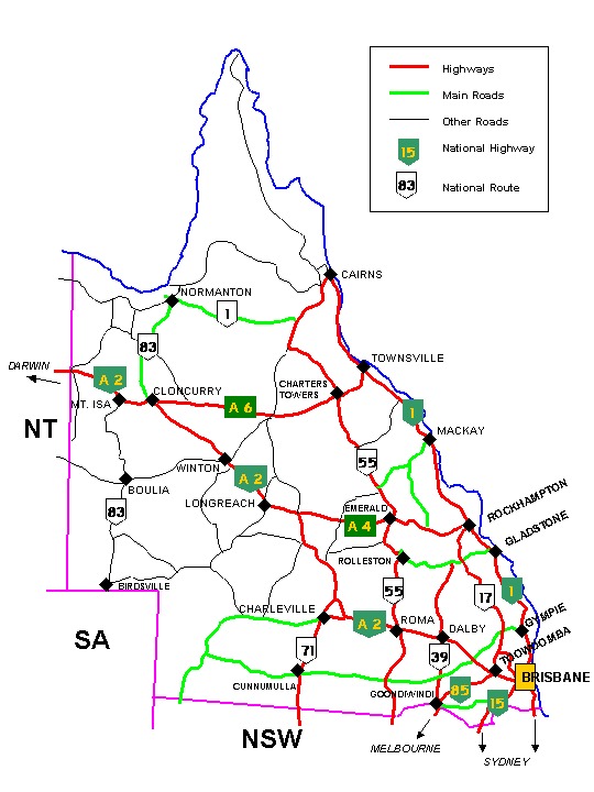 A road map of the State of Queensland, Australia. Find the best route between Brisbane, Cairns, Gladstone, Gympie, Mackay, Rockhampton and Toowoomba Queensland. Locations on this map of New South Wales include Brisbane, Bundaberg, Coolangatta, Charters Towers, Coolangatta, Gladstone, Gold Coast, Gympie, Hervey Bay, Ipswich, Mackay, Maryborough, Mount Isa, Redcliffe, Rockhampton, Sunshine Coast, Toowoomba.