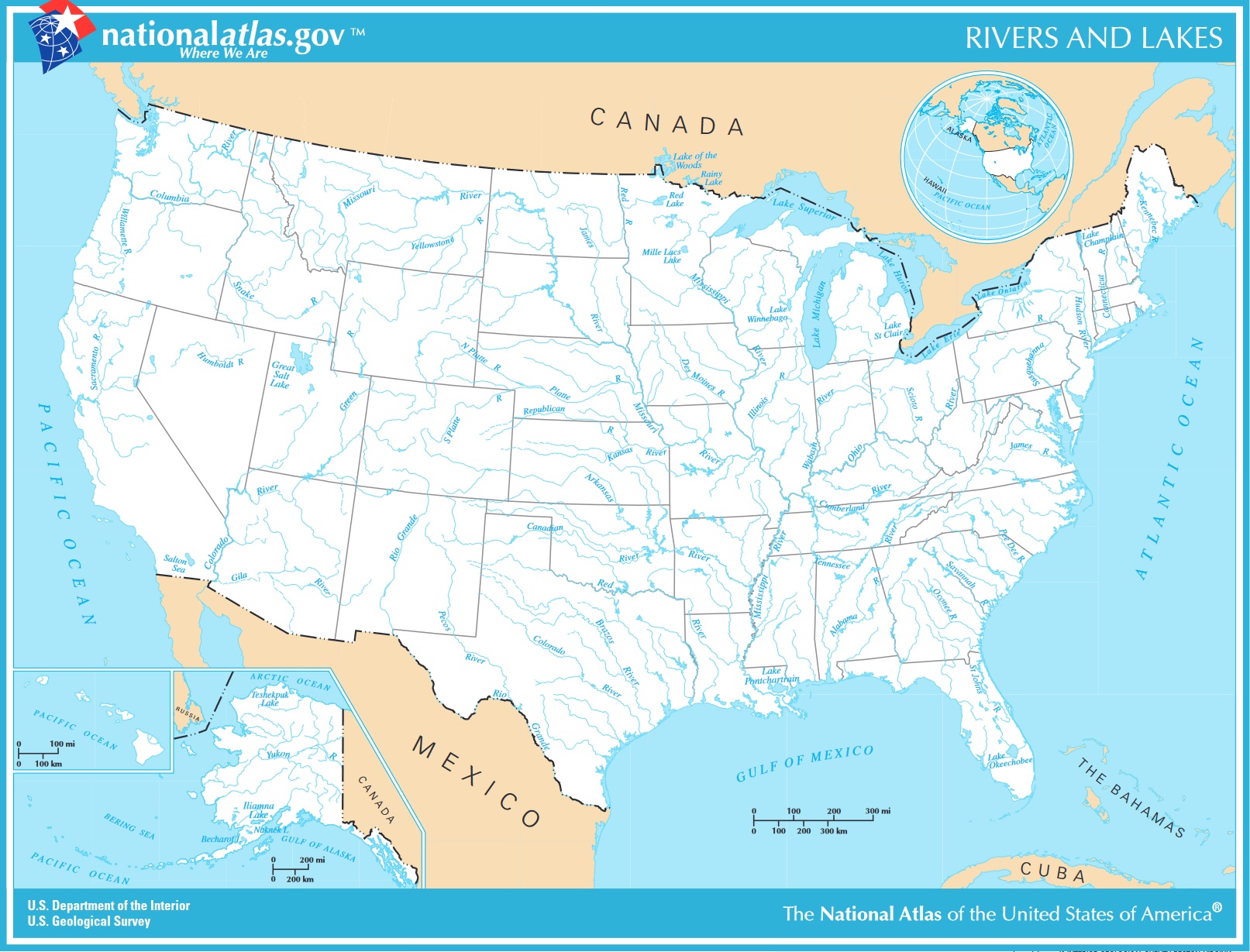 Below you will find a large map of the United States showing major lakes and rivers. This is a large image file. Our website format reduces the display size for uniformity.